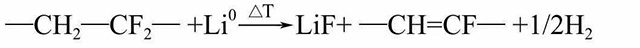 在更高溫度下,負極表面失去了SEI膜的保護,嵌入負極的鋰將與電解液溶劑直接反應有C2H4O產(chǎn)生,可能為乙醛或氧化乙烯。嵌入鋰的石墨在300℃以上與熔融的PVDF–HPF共聚物發(fā)生如下反應: