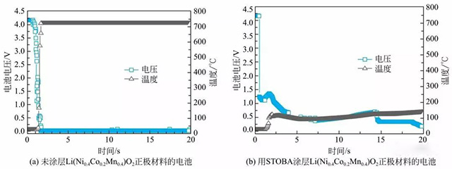 上圖采用一種納米級樹枝狀結(jié)構(gòu)的高分子化合物(STOBA)對NCM(424)進行涂層,當鋰電池發(fā)生異常,產(chǎn)生高溫時,會形成一道薄膜阻隔鋰離子間的流動,穩(wěn)定鋰電池,借以提高電池安全度。由下圖可見,針刺實驗時,正極材料未涂STOBA涂層的電池內(nèi)部溫度在幾秒鐘內(nèi)升至700℃,而用STOBA涂層正極材料的電池溫度最高只有150℃。