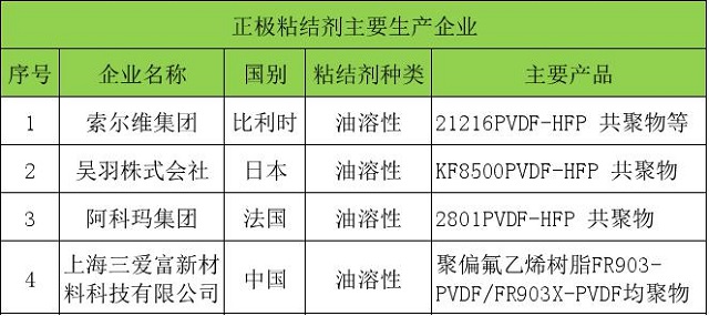 ②比利時的索爾維集團、日本的吳羽株式會社、法國的阿科瑪集團,都是PVDF粘結(jié)劑廠商中的佼佼者,共享全球鋰電池正極粘結(jié)劑的市場。