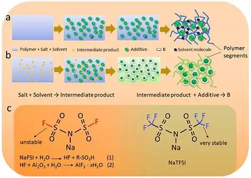 圖1.(a-b)SPE制備過程示意圖:a)傳統(tǒng)過程;b)所設計的過程;(c)NaFSI和NaTFSI的化學結構