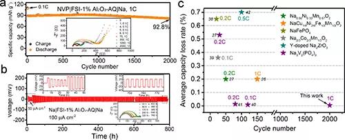 采用磷酸釩鈉(NVP)和金屬鈉(Na)分別作為正極和負極組裝固態(tài)電池NVP|SPE|Na,NVP|FSI-Al2O3-AQ|Na固態(tài)電池首周可逆比容量為110mAh/g,庫倫效率為93.8%,達到了采用液體電解質時的水平。NVP|FSI-Al2O3-AQ|Na固態(tài)電池在1C倍率下循環(huán)2000周的過程中,庫倫效率始終保持在~100%,循環(huán)2000周以后容量保持率為92.8%,平均每周容量衰減率僅為0.0036%。對金屬鈉的對稱電池在100 μA/cm2的電流密度下可穩(wěn)定循環(huán)800h(圖3b)。電池循環(huán)過程中電化學阻抗譜也保持相對穩(wěn)定。采用該研究工作中所設計的SPE組裝的固態(tài)鈉電池的循環(huán)穩(wěn)定性是目前所報道的循環(huán)穩(wěn)定性最好的聚合物固態(tài)鈉電池(圖3)。