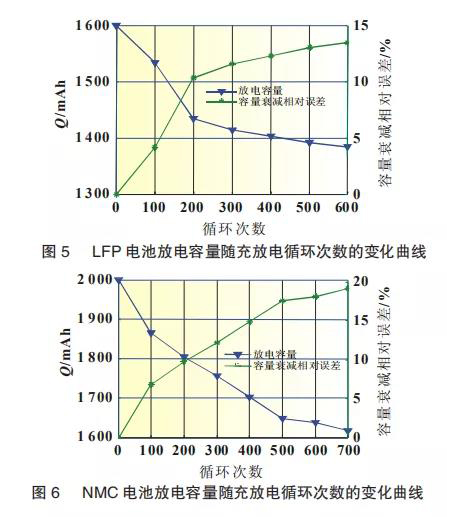 將2000mAh的NMC電池以充電1.0C放電1.0C進行充放電循環(huán)實驗,以電池容量的80%作為壽命截止時的電池容量。取前700 次,以100為間隔次數(shù)對放電容量以及容量衰減相對誤差的百分比進行分析,如圖6所示。