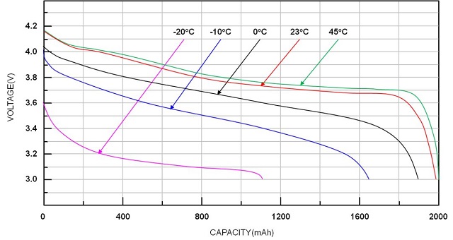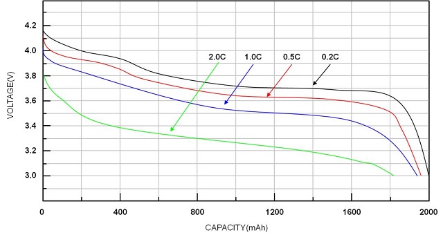 下圖顯示不同放電率下電壓與電池容量的關(guān)系。放電率愈高,電池容量愈低。溫度低時(shí),電池容量也會降低。