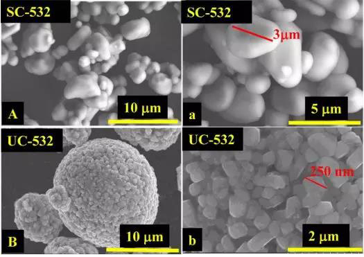 目前鋰電池的三元正極材料的顆粒是由一次顆粒團(tuán)聚而形成的二次顆粒球,直徑通常在幾微米至十微米之間,一次顆粒的大小一般為幾百納米(如圖1B-b所示)。而單晶(single-crystal or monocrystal)三元正極材料的顆粒均為分散的一次顆粒,粒徑通常在5μm以下,也有文獻(xiàn)報(bào)道過納米級(jí)的單晶顆粒,沒有團(tuán)聚而成的二次顆粒存在(如圖1A-a)。這種獨(dú)特的微觀形貌使得單晶三元材料相比二次球材料有著許多優(yōu)勢(shì)。