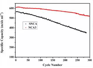 圖2 (a)商業(yè)化球狀NCA顆粒(b)單晶NCA經(jīng)過100次循環(huán)后;(c)循環(huán)穩(wěn)定性對(duì)比。