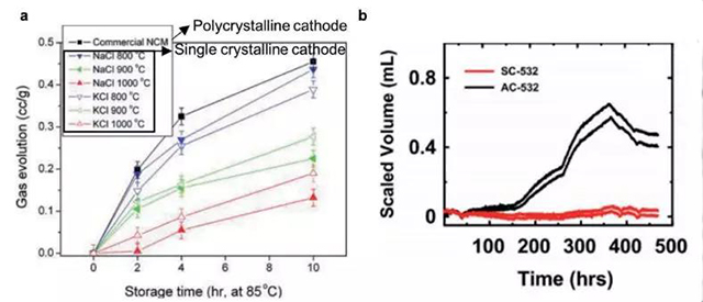 上述的單晶結(jié)構(gòu)穩(wěn)定性不但能夠提升電池的循環(huán)穩(wěn)定性,對(duì)于電池的安全性也是十分重要的。研究者在對(duì)鈷酸鋰的研究中發(fā)現(xiàn),充電后,大粒徑的Li0.5CoO2的熱失控溫度更高,這表明隨著顆粒粒徑的增大,Li0.5CoO2與電解液間的反應(yīng)活性越低,即處于充滿電狀態(tài)下的電池具有更好的熱穩(wěn)定性。對(duì)單晶NCM523和811的研究中也證實(shí)了這一點(diǎn)。如圖3a所示,單晶NCM811充電至4.45V,在80℃的條件下保持10天,可以看出單晶材料所產(chǎn)生的氣體量明顯少于多晶材料;而圖3b為NCM523逐步充電至4.4-4.5-4.6V的狀態(tài)下,分別保持100小時(shí)所產(chǎn)生的氣體量,Al包覆的多晶523(AC-532)在4.4V以上的條件下產(chǎn)氣量明顯增多,而單晶523即使充電至4.6V所產(chǎn)生的氣體量也可忽略不計(jì)。