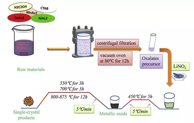Feng Wu等(ref.6)使用水熱法制備了特殊形貌的NCM622前驅(qū)體(圖6b),然后與鋰源混合,使Li/TM=1.06,在不同溫度下燒結(jié)制備出小顆粒的單晶樣品。這種方法不用使用過量太多的鋰源,不過燒結(jié)溫度對(duì)于仍然有著十分重要的影響。
