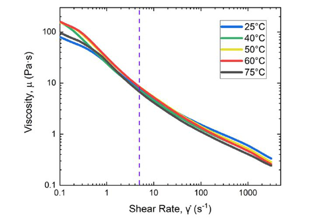 不同溫度下粘度-剪切速率流變曲線如圖5所示。溫度對粘度的影響可以分為兩個區(qū)域:低剪切速率粘度(LSV)和高剪切速率粘度(HSV)。在低剪切速率粘度(LSV)區(qū)域,從25℃到60 ℃范圍內(nèi),黏度隨溫度的升高而增加,但在75℃時黏度下降到25℃的水平。在高剪切速率粘度(HSV)區(qū)域,75℃時漿料具備更低的黏度。這些現(xiàn)象如前描述的聚合物與顆粒之間的鏈接相關(guān)。