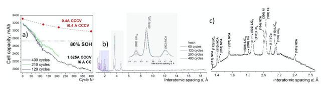 使用三只電池進行循環(huán),分別循環(huán)120次、210次和400次,該電池的初始容量為3170mAh,經(jīng)過120次循環(huán)后電池剩余容量為2528mAh,經(jīng)過210次循環(huán)后剩余容量為2346mAh,經(jīng)過400次后剩余容量為1950mAh,表明該電池循環(huán)性能較差,在經(jīng)過120次循環(huán)后電池容量就降低到了80%以下,這主要是受到作者采用的充放電電流比較大的影響。下圖b為新電池和循環(huán)老化后的電池的單頻中子衍射圖譜,從下圖b中能夠看到該圖譜主要是由NCA正極、石墨相1和相2,Al箔和Cu箔,以及18650電池的不銹鋼外殼構(gòu)成。
