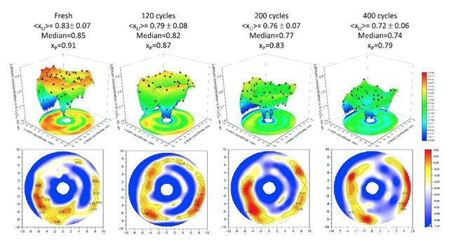 下圖最下層是Li的分布圖,其中淺色區(qū)域為Li的平臺濃度區(qū)域,從下圖可以看到隨著循環(huán)次數(shù)的增加,平臺濃度區(qū)域數(shù)量在減少,同時Li含量較高的深色區(qū)域主要集中在電芯的外部區(qū)域,表明隨著循環(huán)次數(shù)的增加電池內(nèi)部的Li濃度分布均勻性也在逐漸降低。