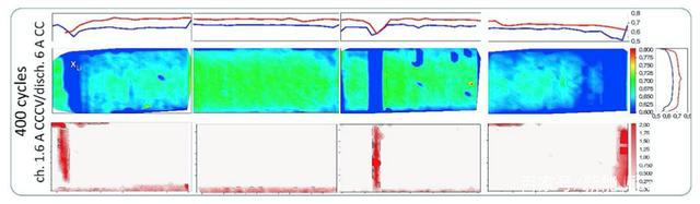 雖然上面的測試數(shù)據(jù)表明隨著循環(huán)次數(shù)的增加,Li在負極分布的均勻性持續(xù)降低,但是上述的測試結(jié)果分辨率仍然比較低,因此雖然從測試結(jié)果可以看到Li的濃度分布均勻性在降低,但是不同電池之間的差距并不大。為了獲得更高分辨率的Li分布圖像,作者降新電池和循環(huán)400次后的電池進行了解剖,將滿電負極取出,采用粉末衍射的方式對鋰的分布進行了檢測。下圖c展示了負極中Li的分布。從圖中能夠看到在新電池中除了受到正極部分區(qū)域沒有活性物質(zhì)的影響,負極相應(yīng)位置的Li濃度比較低外,其余位置的負極中Li的分布比較均勻,但是在電極的寬度方向能夠看到上下邊緣的Li濃度稍低,這主要是受到在電極內(nèi)部電流分布的影響。