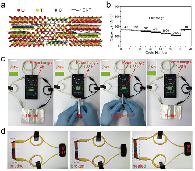 圖一:(a) 所制備的復(fù)合膜電極中titania和Ti3C2片層堆垛示意圖;(b) 電流密度40mA/g至2000mA/g范圍內(nèi)復(fù)合膜電極的倍率性能;(c) 兩個串聯(lián)的軟包電池在不同形變時給智能手機穩(wěn)定充電;(d) 電池切割前后和自修復(fù)后為電子手表供電。