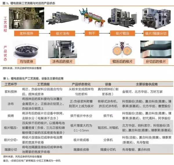 鋰電池生產(chǎn)前階段對應的鋰設備主要有真空混合機、涂布機、輥壓機等;中間工序主要包括模切機、繞線機、層壓機、噴液機等。;后端流程包括化學成型機、體積檢測設備、流程倉儲和物流自動化等。此外,電池組生產(chǎn)需要電池組自動化設備。