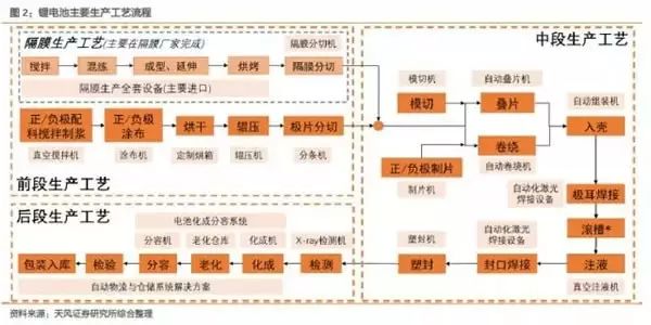 鋰電池生產(chǎn)過程復雜,主要生產(chǎn)過程主要包括電極生產(chǎn)的攪拌和涂覆階段(前階段)、電池單體合成的卷繞和注液階段(中間階段)以及化學包裝的包裝檢驗階段(后階段)。價值(購買金額)約占(35~40%):(30~35)%:(30~35)%。差異主要來自不同的設備供應商、進口/國產(chǎn)比例的差異等。流程基本相同,價值比例有偏差,但總體符合比例。