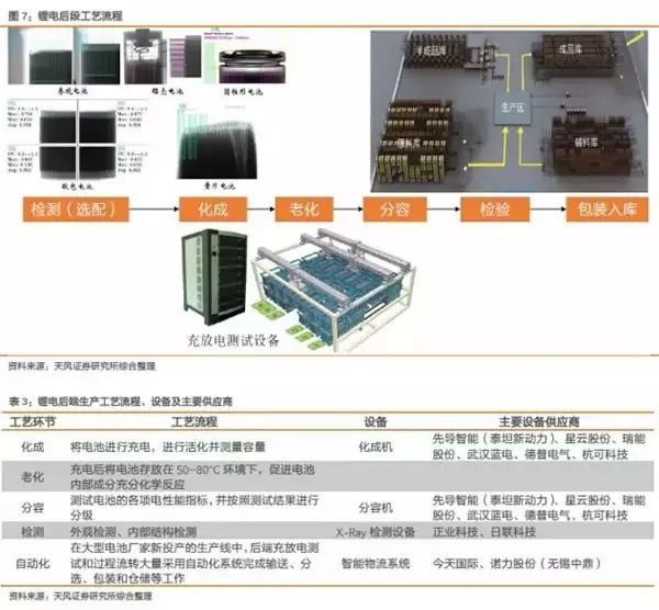 鋰電后段生產(chǎn)工藝主要為分容、化成、檢測和包裝入庫四道工序,占生產(chǎn)線價值量約35%?;珊头秩葑鳛楹蠖喂に囍凶钪饕h(huán)節(jié),對成型的電池進行激活檢測,由于電池的充放電測試周期長,因此設備的價值量最高?;晒に嚨闹饕饔迷谟趯⒆⒁悍庋b后的電芯充電進行活化,分容工藝則是在電池活化后測試電池容量及其他電性能參數(shù)并進行分級。化成和分容分別由化成機和分容機通常由自動化分容化成系統(tǒng)完成。