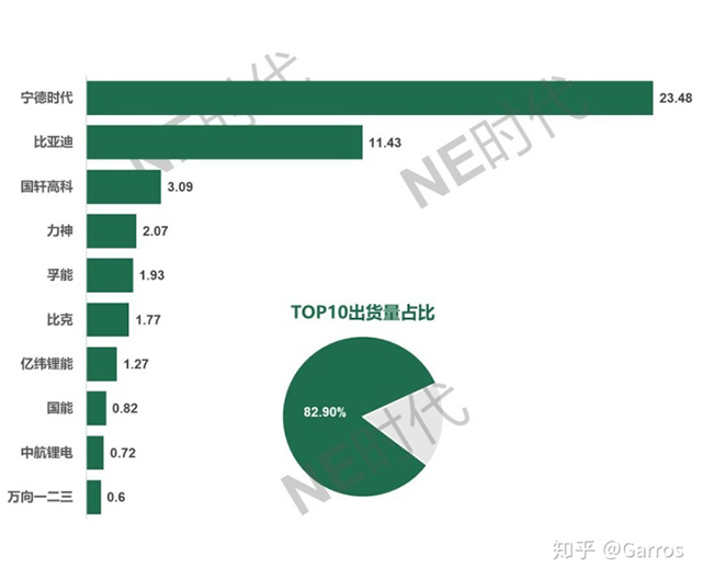 圖為2018年鋰電池出貨量排名。由此可見,寧德時代和比亞迪遙遙領先,郭萱高科技、李紳和富能的其他出貨量均低于10千兆瓦時。