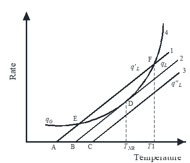 圖2. 熱自燃理論:A、B、C三種環(huán)境溫度條件下反應(yīng)速率、系統(tǒng)散熱速率與溫度之間的關(guān)系。A是安全環(huán)境溫度;B臨界危險溫度,樣品溫度可以達(dá)到TNR,如果環(huán)境溫度超過B,產(chǎn)熱速率大于散熱速率,系統(tǒng)將進(jìn)入熱失控狀態(tài)。