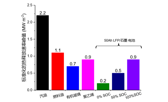 圖7. 不同荷電狀態(tài)的50Ah磷酸鐵鋰/石墨型鋰離子電池標(biāo)準(zhǔn)化后的HRR峰值(除以電池表面積,MW m-2)及與其他常見可燃物的比較