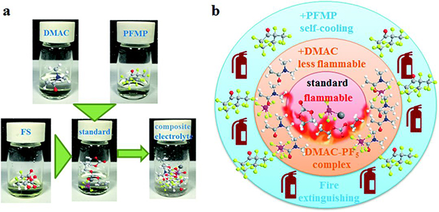 圖8. 復(fù)合電解液原理圖,(a)為組分原理圖,(b)為安全電解液的工作原理。復(fù)合電解液包含PFMP,DAMC和FS,商業(yè)電解液(1.0 M LiPF6/EC+DEC (1:1 wt))作為基準(zhǔn)電解液