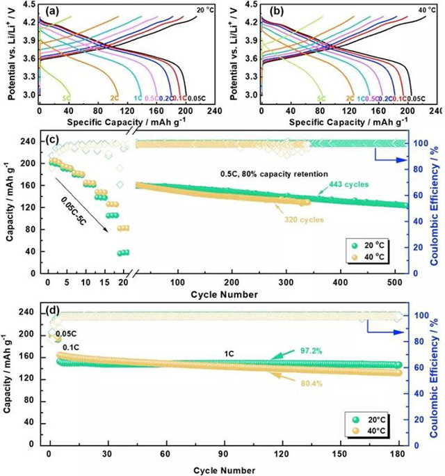 在保持電壓范圍恒定的情況下,作者進(jìn)一步評估了包含SI10-05-70%PC電解液的Li/NCM811電池在20℃和40℃下的倍率性能和恒流循環(huán)性能(圖4)。20℃下,在0.05C首圈充放電過程中,Li / NCM811電池的可逆放電容量為201 mAh g-1(圖4a),非常接近在0.1C下的可逆放電容量。40℃下,Li/SI10-05-70%PC/NCM811電池在0.05C循環(huán)得到更高的放電容量(圖4b),這可能是由于在升高的溫度下電極反應(yīng)動力學(xué)增強(qiáng)。但是,由于在高溫下發(fā)生了不可逆的副反應(yīng),在20℃時的首圈庫侖效率比40℃時的高。從第一個循環(huán)就已經(jīng)可以看出,增強(qiáng)的反應(yīng)動力學(xué)對容量提升是有利的,但會降低庫侖效率(圖4a-c)。