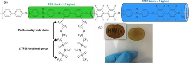 圖1:a)SI10-05離聚物的分子結(jié)構(gòu),親電性PES嵌段以綠色突出顯示,而親電性FPES嵌段以藍(lán)色突出顯示。b)在兩個聚酯薄膜之間壓制后,SI10-05-70%PC離聚物膜的照片。