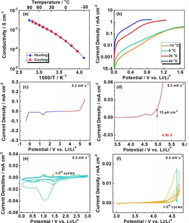 圖2:a)SI10-05-70%PC電解質(zhì)的離子電導(dǎo)率隨溫度的變化。b)確定各種溫度下的極限電流密度。c)線性掃描伏安法確定電化學(xué)穩(wěn)定性窗口。d)確定氧化穩(wěn)定性。e,f)循環(huán)伏安法研究氧化還原過程。