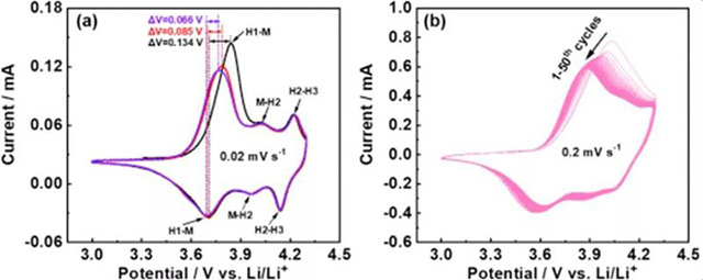 圖3:循環(huán)伏安法(電壓范圍在3.0 V至4.3V)。a)以0.02 mV s-1的掃描速率進(jìn)行三個循環(huán);b)50個連續(xù)的CV循環(huán),掃描速率為0.2 mV s-1。