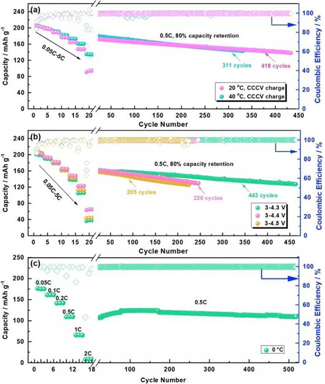 圖8. a)恒壓階躍對Li / SI10-05-70%PC / NMC811全電池倍率能力和長期恒流循環(huán)影響的比較。b)研究將上限電壓從4.3 V擴(kuò)展到4.4V和4.5 V對Li / SI10-05-70%PC / NCM811全電池性能的影響。c)研究Li / SI10-05-70%PC / NCM811全電池在0℃下的性能。